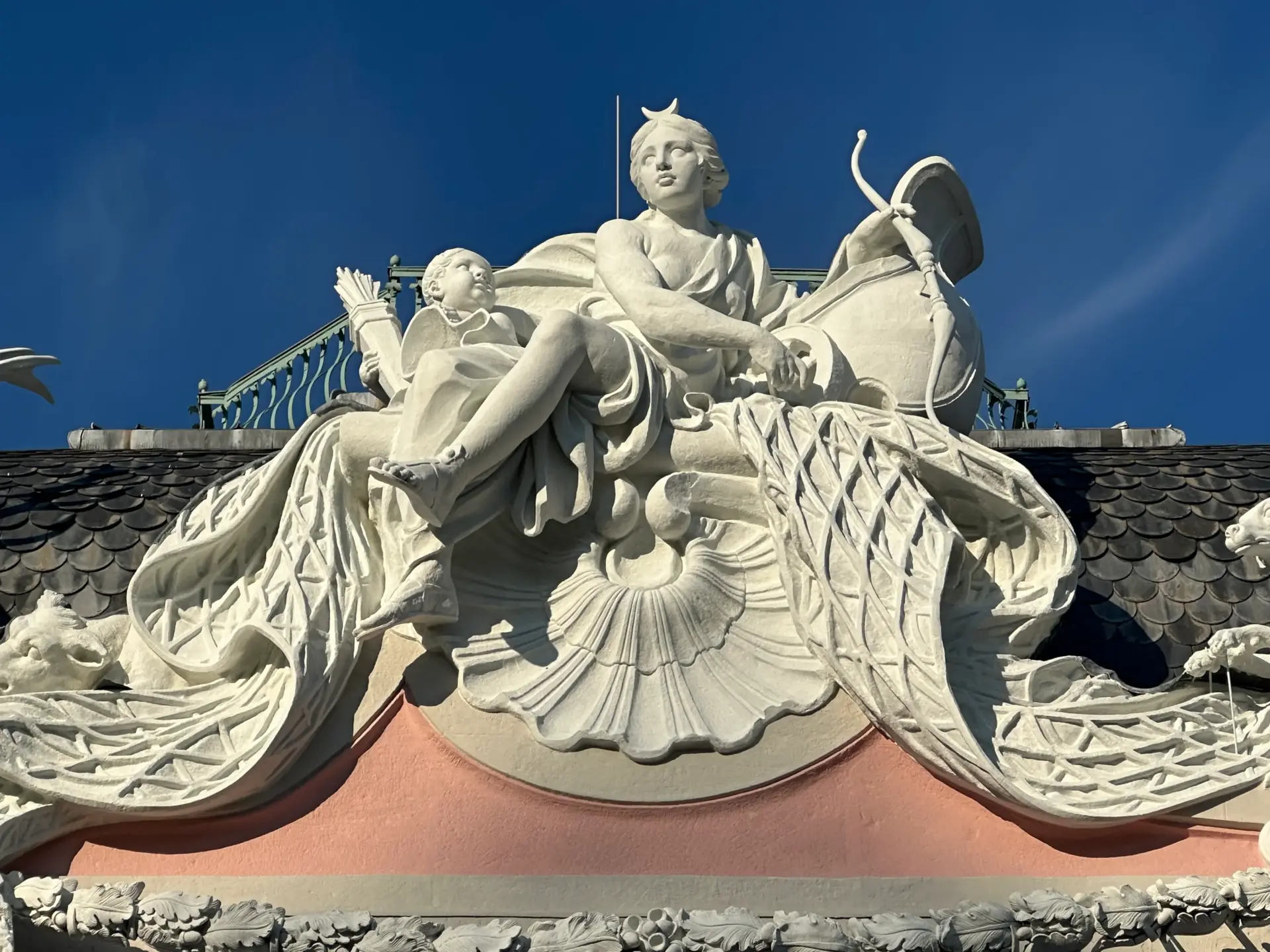 Diana, die Göttin der Jagd und zentrale Gestalt des großen Jagdzuges, blickt auf den Spiegelweiher an der Südseite von Schloss Benrath. Die eindrucksvolle und im letzten Jahr restaurierte Skulpturengruppe unterstreicht den Charakter des Schlosses als Jagdschloss. Diana, auf einem großen Fangnetz sitzend, steigt aus ihrem Wagen und wendet sich ihrem Revier, dem Jagdpark, zu. Zu ihren Füssen hat die Jagd begonnen. An der westlichen Ecke bläst ein Putto das Jagdhorn, während Hunde den Hirschen greifen und weitere Putti mit Hunden und Tieren folgen.