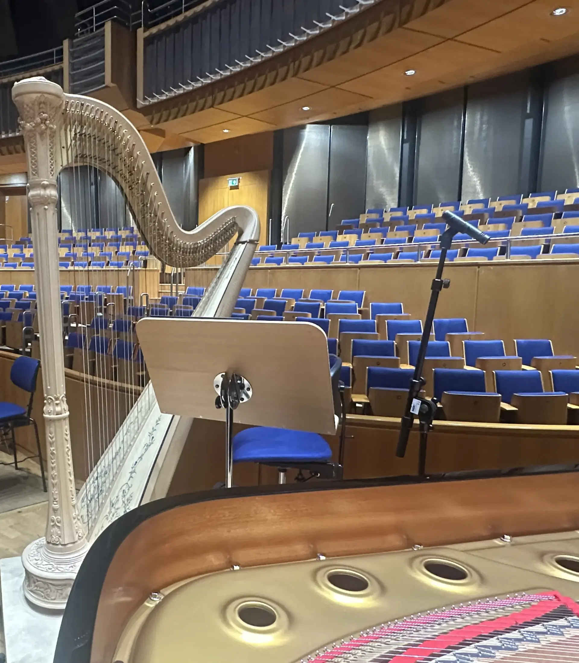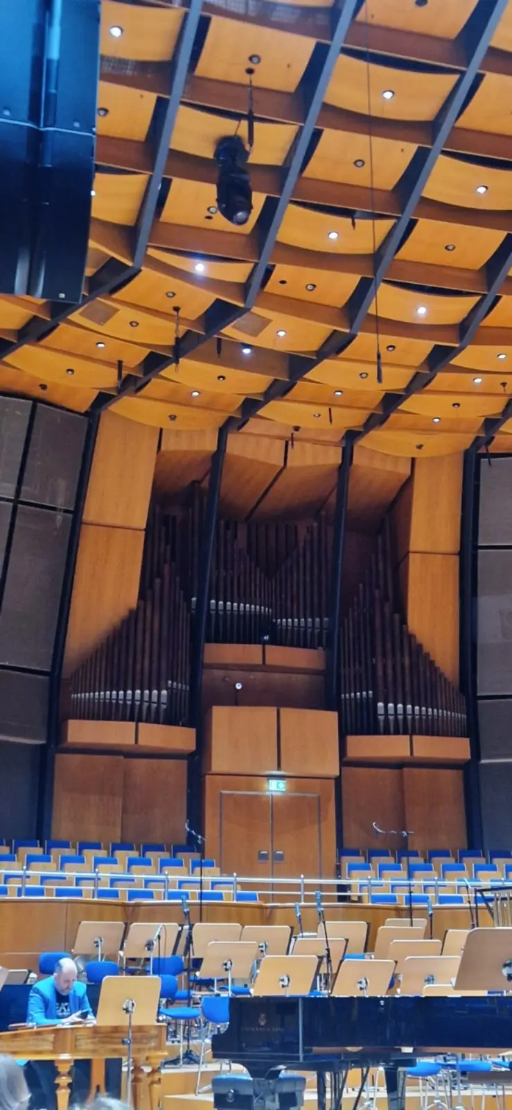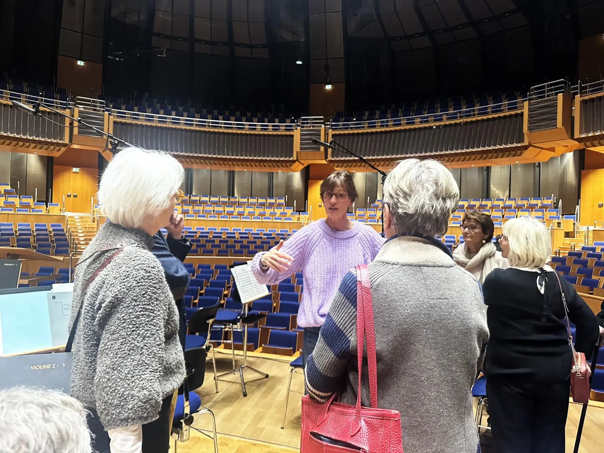 Der Rundgang ging weiter auf die Bühne des großen Saals, von der der Blick in den Sternenhimmel der Kuppel faszinierend war. Der Saal wird jetzt „Mendelssohn-Saal“ genannt und hat Platz für knapp 2000 Personen. Wir konnten auch den „backstage-Bereich“ betreten, der Platz für die Instrumente der Künstler und für die Steuerung von Licht und möglicher Tonaufnahmen.