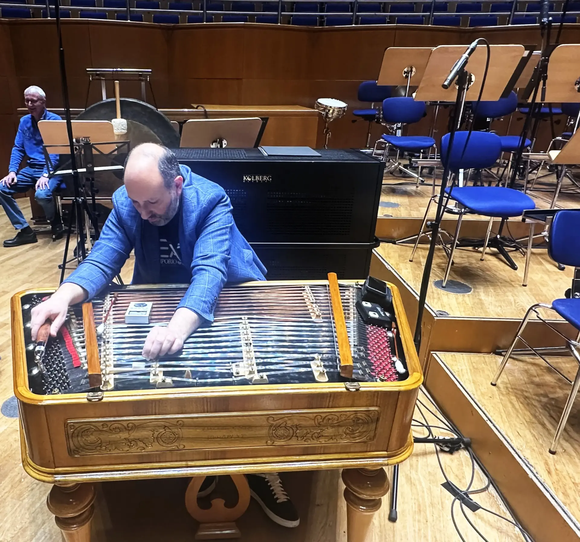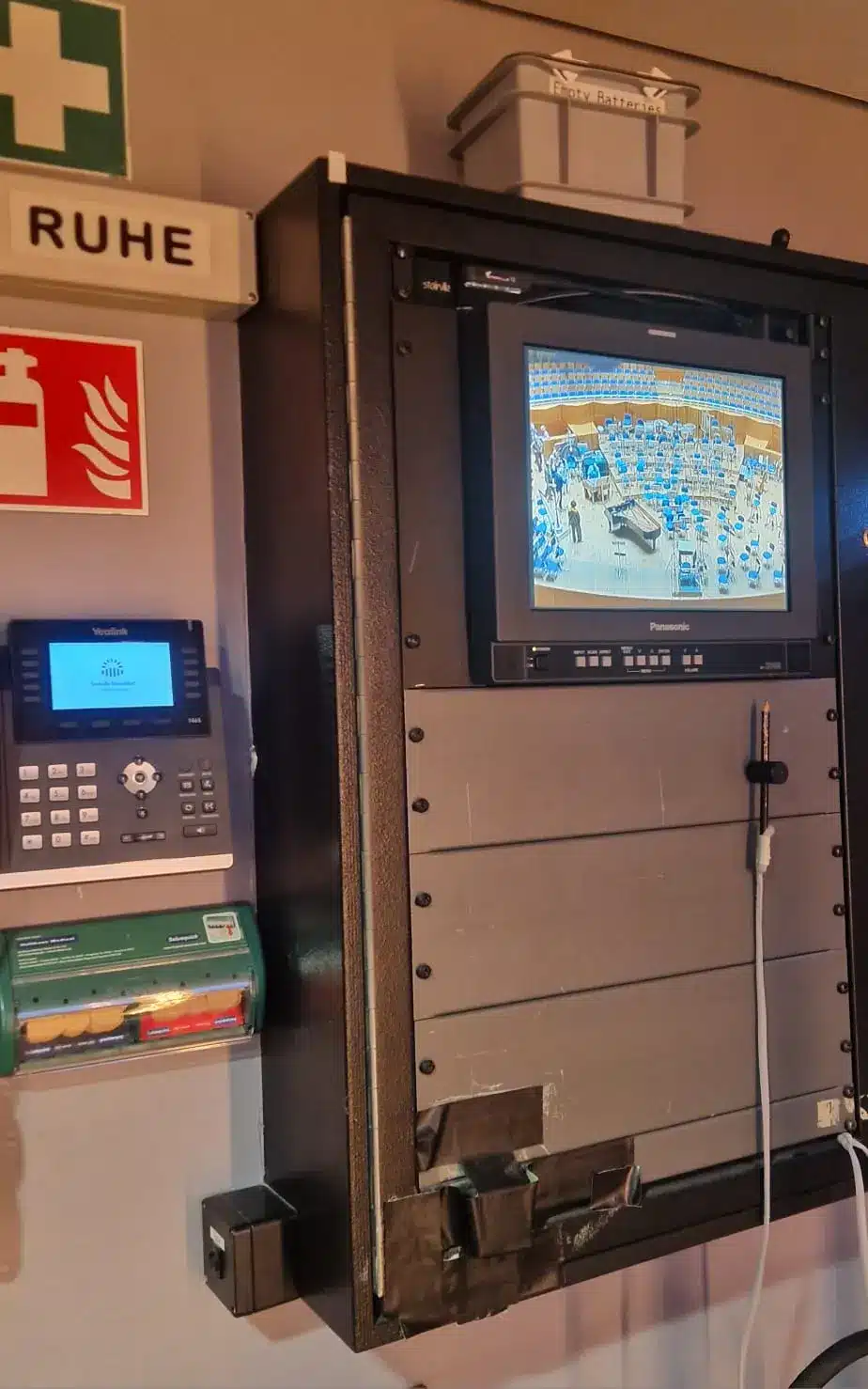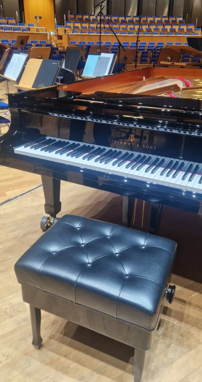Der Rundgang ging weiter auf die Bühne des großen Saals, von der der Blick in den Sternenhimmel der Kuppel faszinierend war. Der Saal wird jetzt „Mendelssohn-Saal“ genannt und hat Platz für knapp 2000 Personen. Wir konnten auch den „backstage-Bereich“ betreten, der Platz für die Instrumente der Künstler und für die Steuerung von Licht und möglicher Tonaufnahmen.