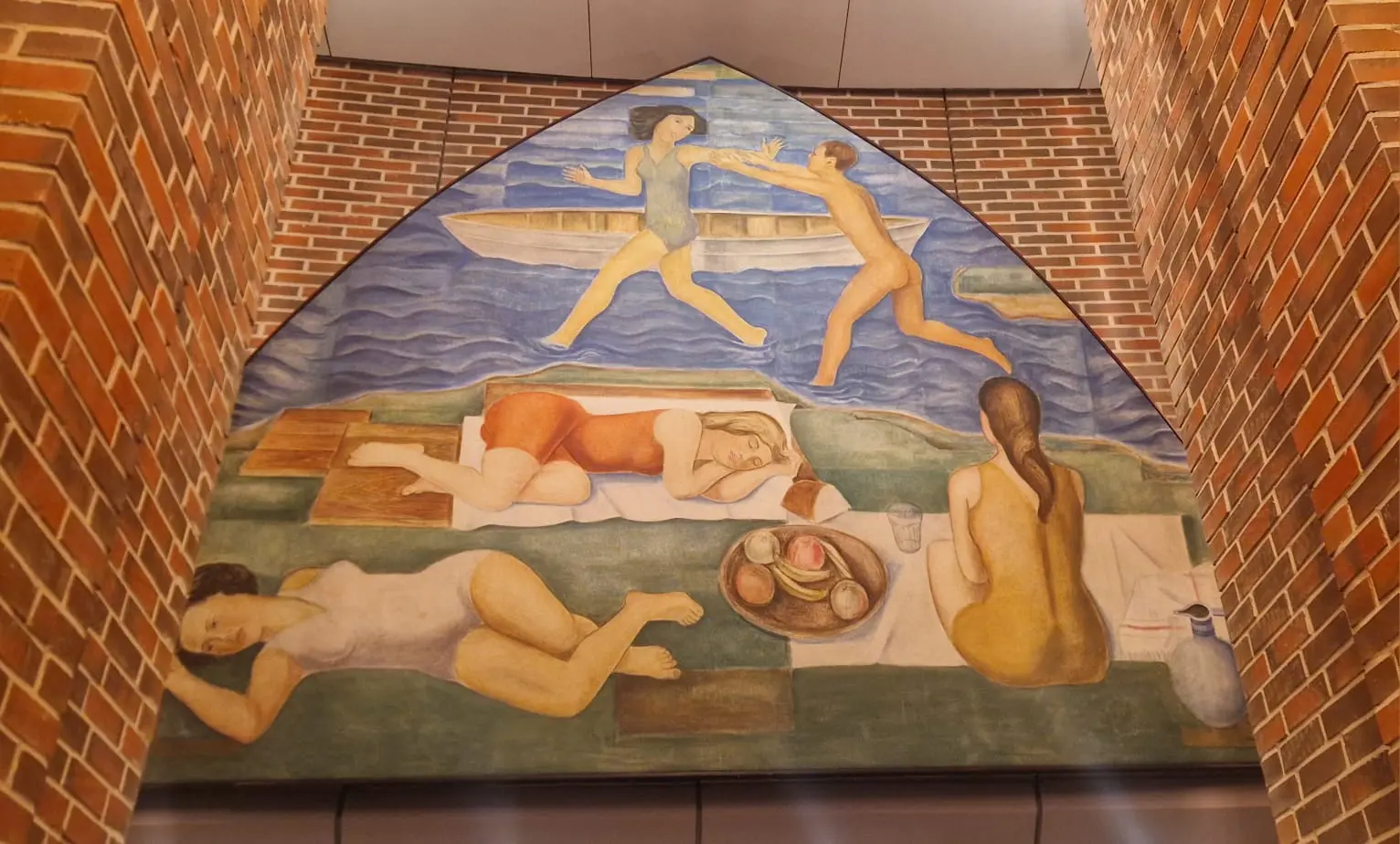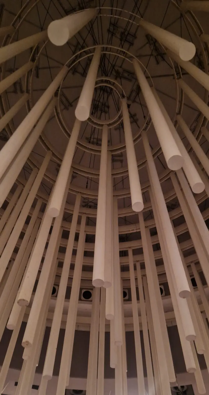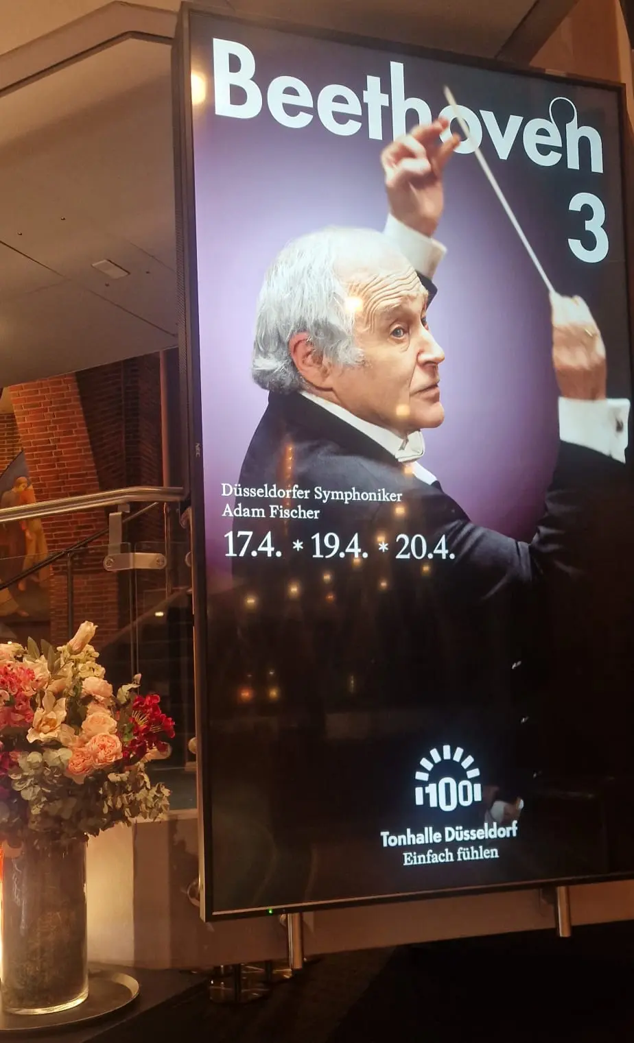 Auf dem Rundgang wurden wir immer wieder aufmerksam gemacht auf verschiedene Kunstwerke in der Tonhalle: zu Beginn auf die Stalaktiten in der Decke der Rotunde von Günther Uecker, weiter auf die 21 Hohlspiegel an der Decke des „Mendelssohn Saals“ von Adolf Luther, auf die großen Wandbilder, die sogenannten Zwickelbilder, im äußeren Umgang des Foyers von Malern des „Jungen Rheinlands“ und schließlich auf die Glaskunstwerke in den Vitrinen des Grünen Gewölbes. Als nach einer guten Stunde in der Tonhalle bereits die Vorbereitungen für das abendliche Konzert begannen, verabschiedeten wir uns mit Beifall und großem Dank von unseren sachkundigen Führern.
